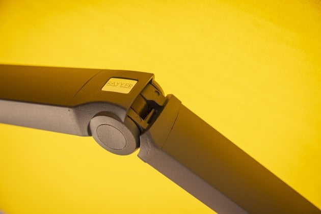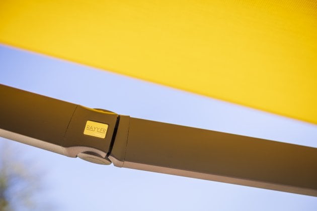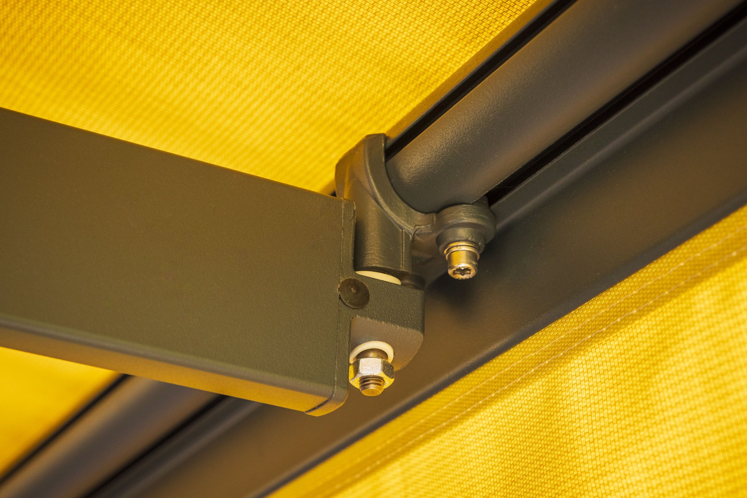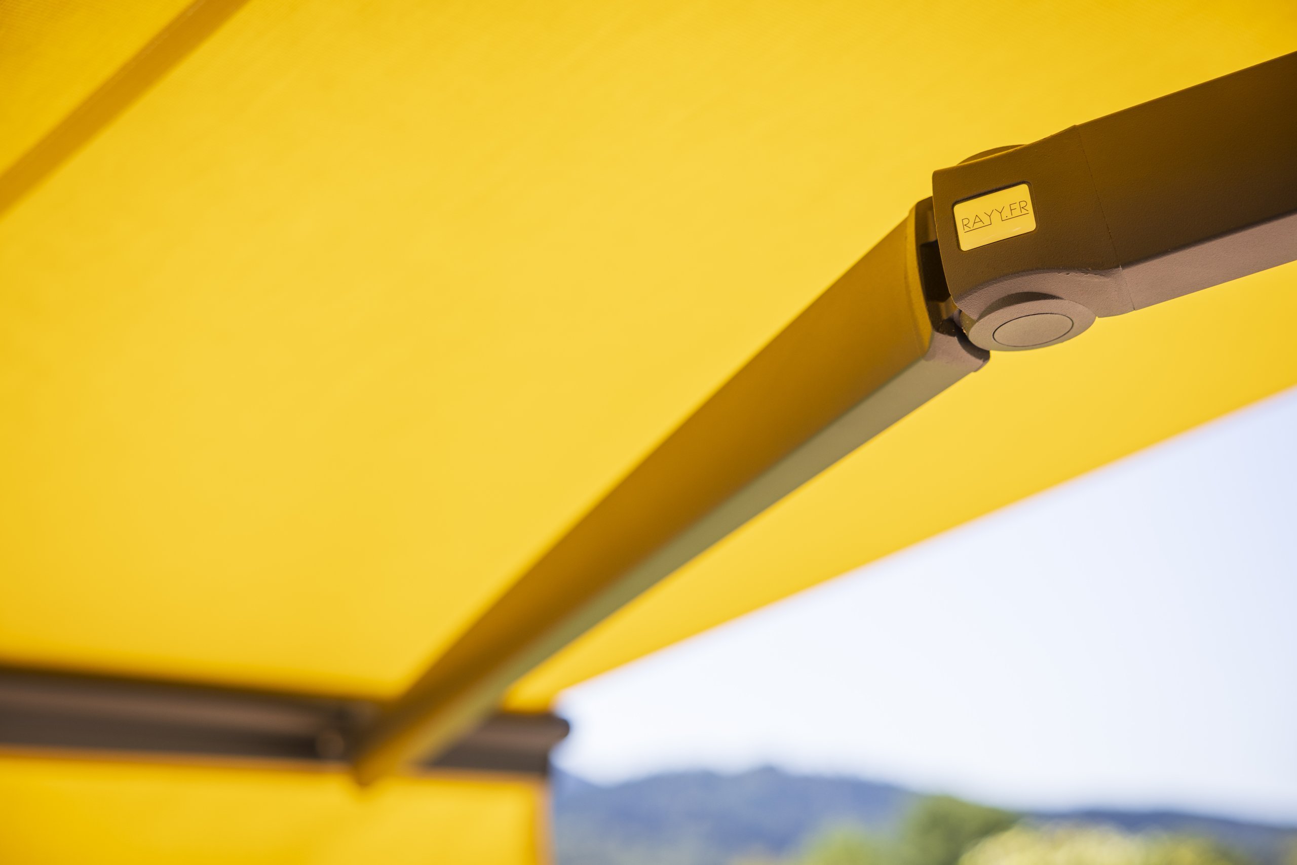 Le store loggia Rayy est équipé de bras très solide. Il est l’un des bras qui détient le plus d’innovations technologiques. Les deux profils de bras sont de forme trapézoïdales et symétriques en hauteur et en largeur pour plus de stabilité et de compensation des forces. Aucun câble ou chaine n’est visible. Tout est parfaitement intégré et du même coloris que l’armature du store. Il est, sans aucun doute, le bras le plus performant et esthétique du marché. Enfin, c’est ce que nos équipes pensent de lui.