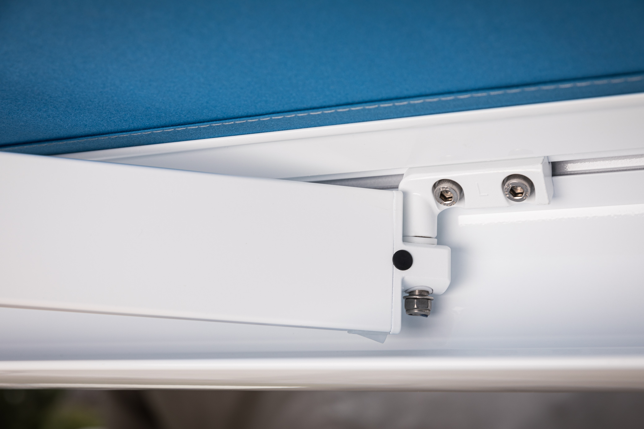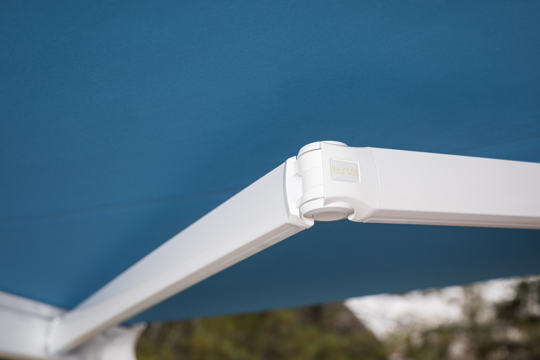 Le store Rayy XL est équipé de bras très solide. Il est l’un des bras qui détient le plus d’innovations technologiques. Les deux profils de bras sont de forme trapézoïdales et symétriques en hauteur et en largeur pour plus de stabilité et de compensation des forces. Aucun câble ou chaine n’est visible. Tout est parfaitement intégré et du même coloris que l’armature du store. Il est, sans aucun doute, le bras le plus performant et esthétique du marché. Enfin, c’est ce que nos équipes pensent de lui.