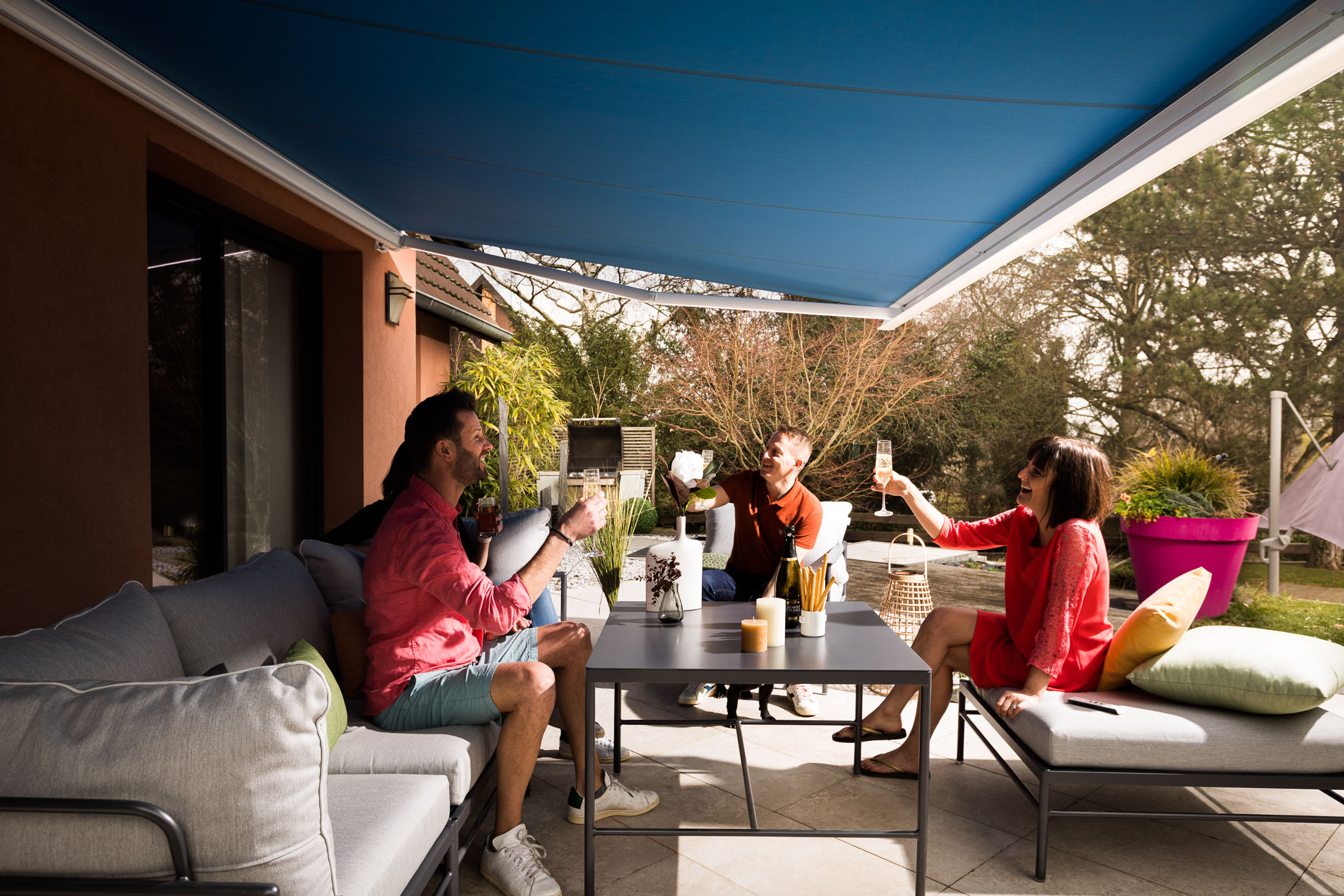 Pas de compromis : 1200 combinaisons de couleurs, moteur et télécommande SOMFY IO, toile DICKSON Orchestra, pose murale ou plafond.