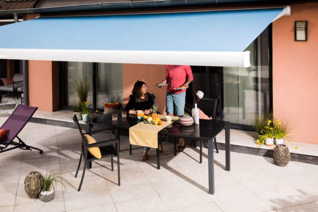 Fabriqué sur-mesure et offrant le choix parmi 1200 combinaisons de couleurs de toiles et d’armatures, Rayy peut être augmenté d’un automatisme vent Somfy et de lumières LED à variateur.